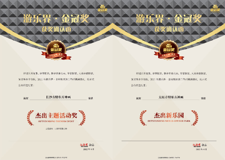 近日,由《游樂界》雜志主辦的2021年度“金冠獎(jiǎng)”發(fā)布獲獎(jiǎng)榜單,華強(qiáng)方特集團(tuán)旗下大型高科技主題樂園“太原方特東方神畫”和“長(zhǎng)沙方特東方神畫”,分別獲得“中國杰出新樂園”和“杰出主題活動(dòng)獎(jiǎng)”。