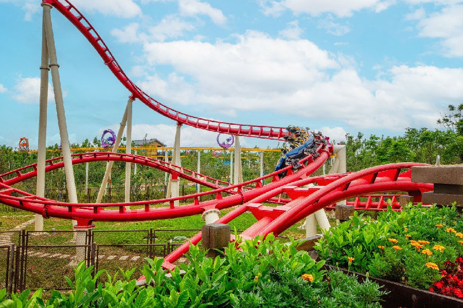 在《翻江倒海》中,游客從高臺入口處滑下,在急速回旋的滑道中釋放激情,體驗“翻江倒海”的緊張刺激;隨著空中盤旋扭曲的大回環急速墜落,急速俯沖而下,盡享《比翼雙飛》的激爽與暢快;“魔幻水城”《熊出沒水寨》,融合盤旋而上的階梯與水滑道等多種戲水設備于一體,組成老少皆宜的家庭戲水項目群;《颶風灣》是模擬大海的“真空造浪池”,可以創造9種不同海浪的新奇體驗,1.5米的連續海浪和3米的大海嘯從不同方向沖擊水岸,海浪波濤洶涌,將陣陣清涼席卷而來,讓游客享受浪花強力沖擊時的無限歡樂。