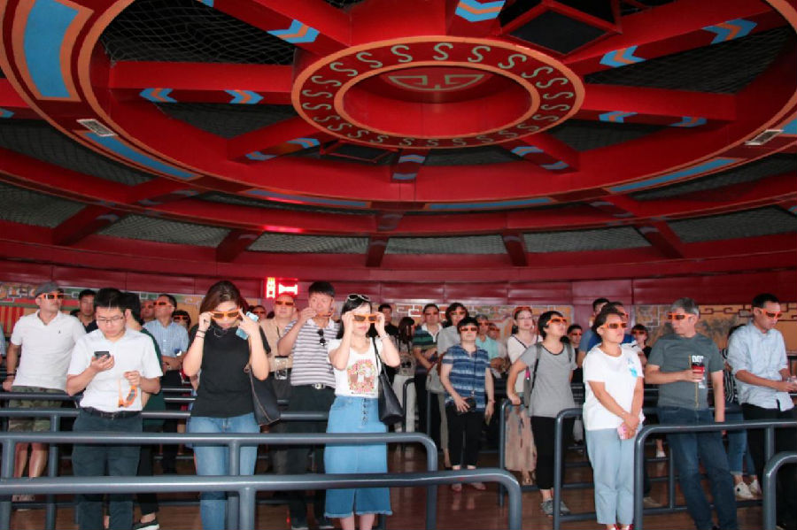 次日,華強方特盛邀參編單位專家全面了解方特主題樂園的不同產品。與會專家先后參觀了方特歡樂世界、方特夢幻王國兩座主題樂園。專家們饒有興致地體驗了《飛越千里江山》、《千古蝶戀》等項目,給予極高的評價和贊譽。大家表示,方特主題樂園的高科技“飛行觀畫”模式,讓人仿佛真的“翱翔”于千里江山間,如臨其境體會了傳世國寶的動人魅力。如夢如幻的“千古蝶戀”運用四面“幻影成像”全息投影舞臺,配合專業演藝者的現場表演,亦真亦幻地演繹了梁山伯與祝英臺的曠世之戀,高科技與舞臺藝術完美結合的演出,贏得現場體驗的專家們一致好評。