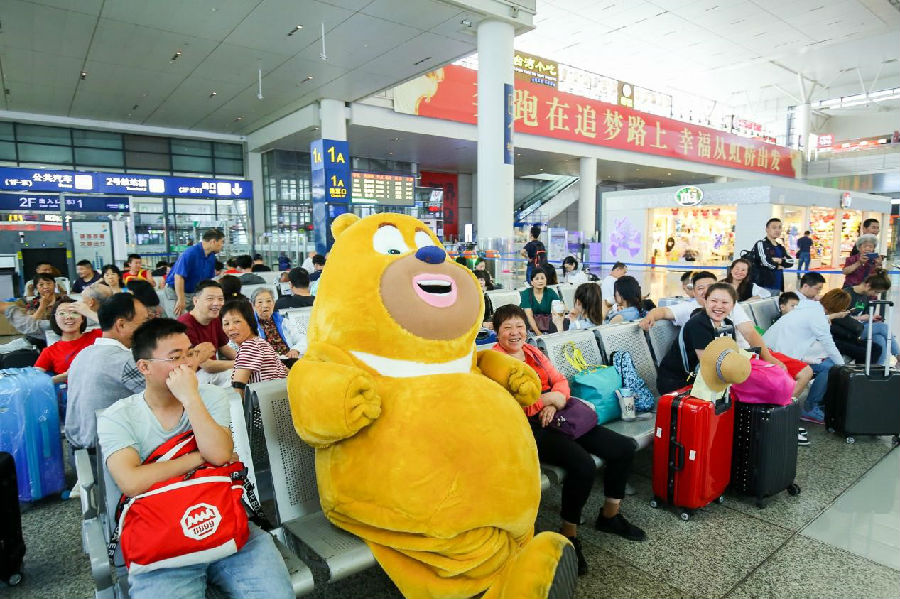 動車組發車儀式當日,逗趣可愛的熊大、熊二、光頭強與寧波方特東方神畫的神話IP人物,把歡樂帶到了虹橋站候車大廳和站臺,讓發車儀式有了一個快樂的開始。他們手持創意拍照板與游客互動,成為車站中一道靚麗的風景線。隨后,在簡短的嘉賓致辭和趣味抽獎環節后,參加首發儀式的來賓們共同揭幕,正式宣布“方特號”動車組隆重發車。