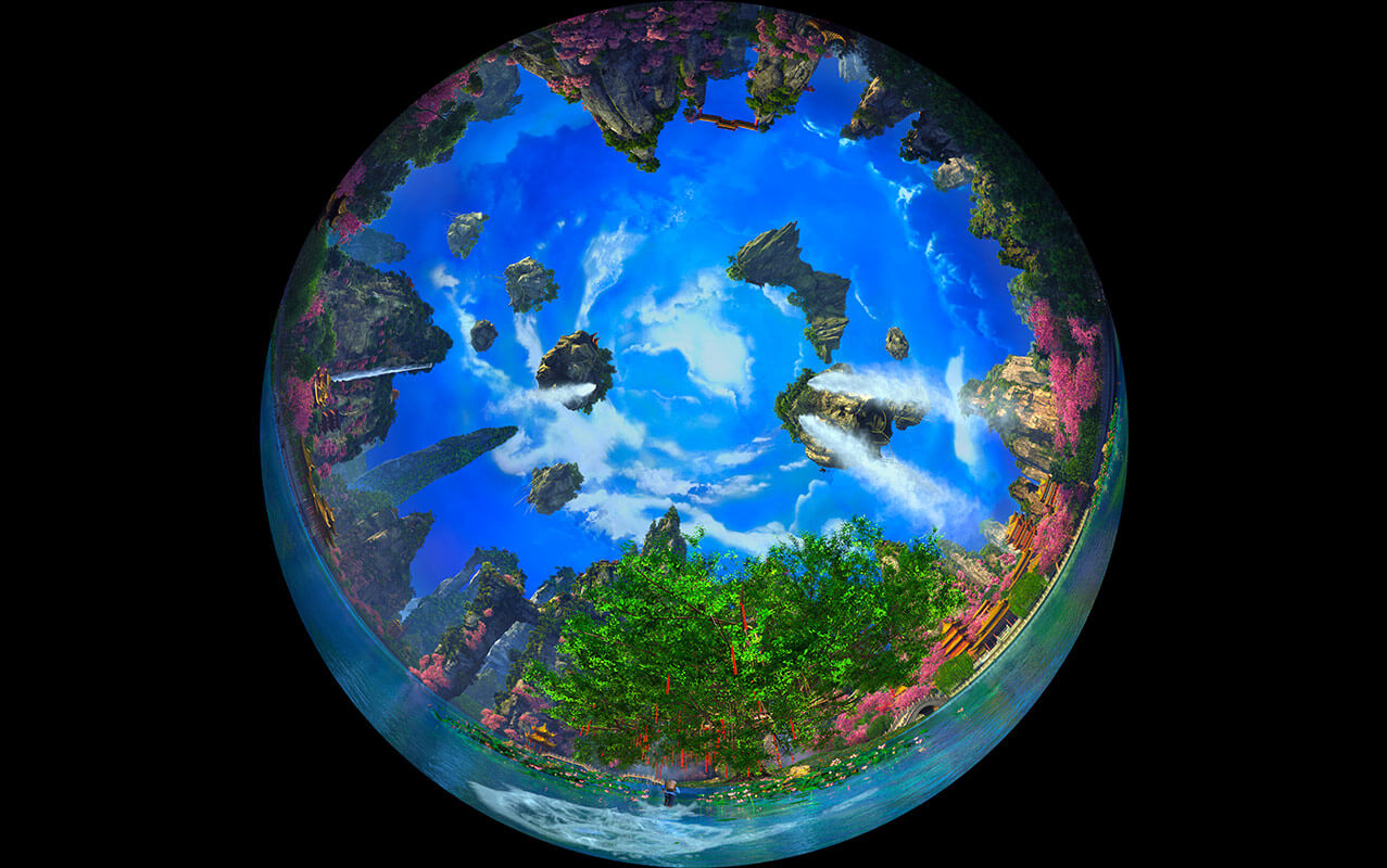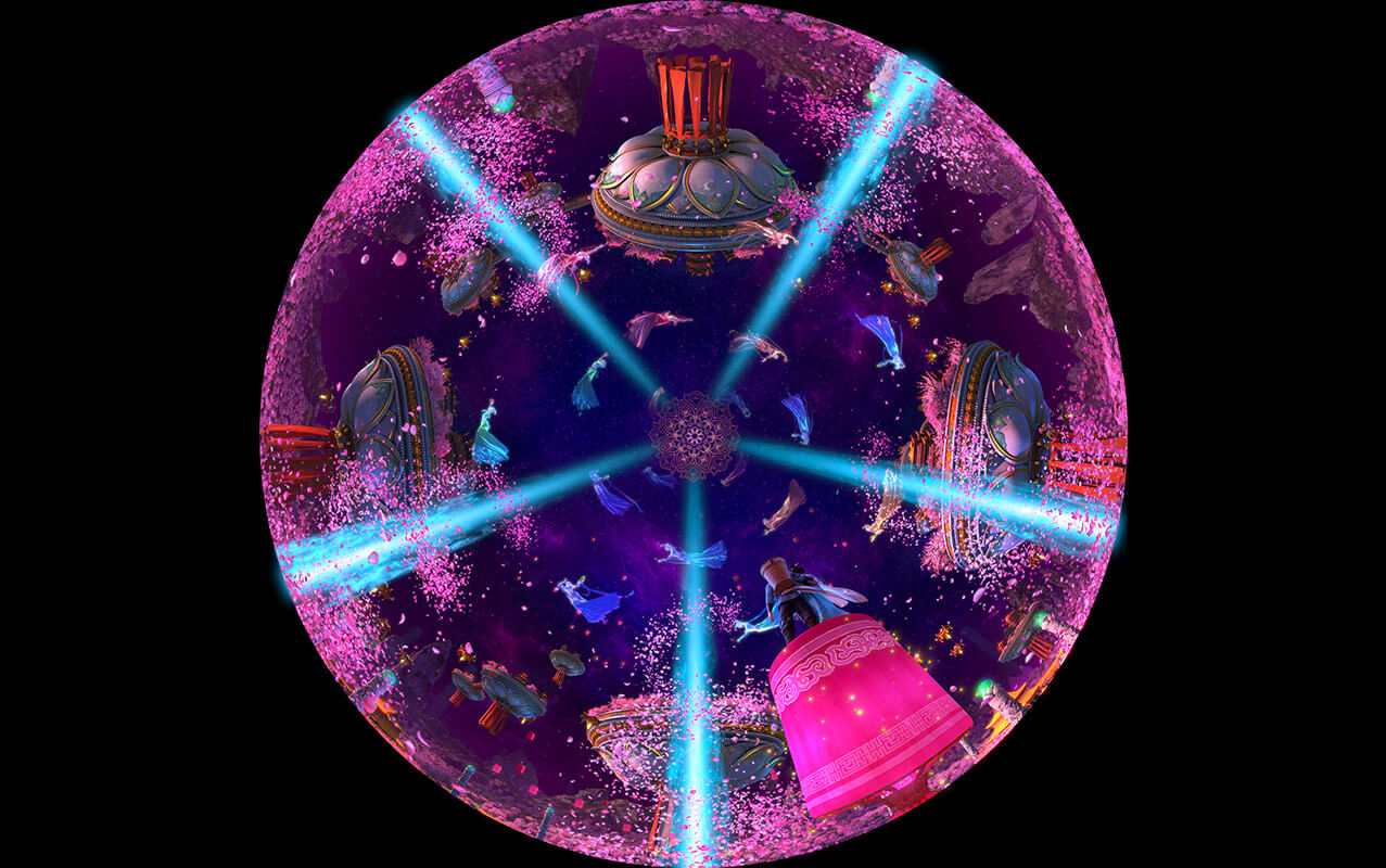 《牛郎織女》項目作為室內升降式穹頂影片的代表。使用真人實拍結合三維的形式,重新演繹經(jīng)典愛情神話傳說“七夕鵲橋戀”。重點展現(xiàn)了牛郎飛上天庭尋妻,與織女鵲橋相會的情節(jié),并將其打造成為一個恢弘絢麗的魔幻歷險題材主題項目。