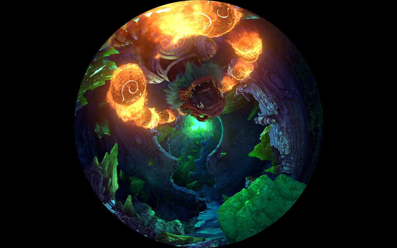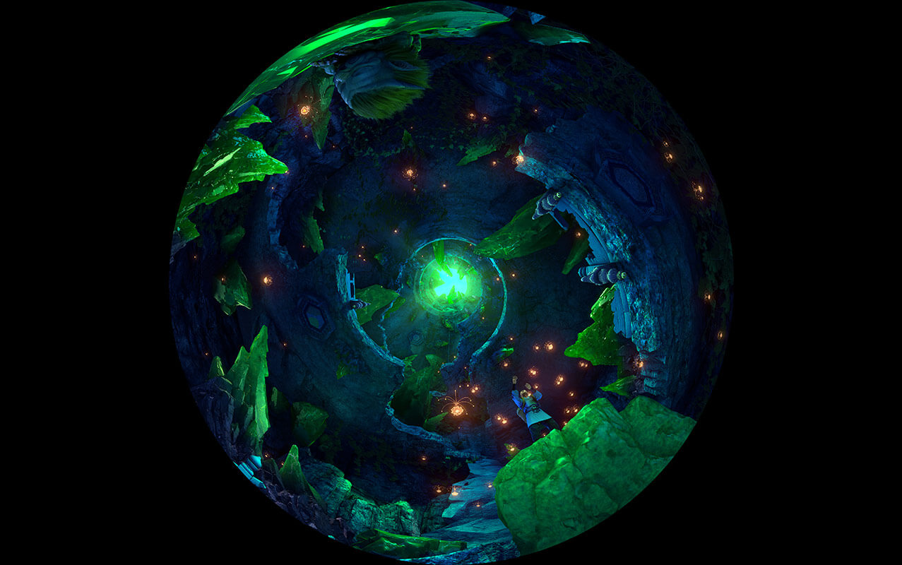 室內升降式穹頂影院主演廳分為兩層,通過大型旋轉升降式平臺連接。一層為多媒體實景舞臺,多種銀幕與實景相結合,二層為穹頂式球幕表演。根據(jù)劇情發(fā)展帶領觀眾乘坐超大型提升平臺從一層提升到9米高的二層觀影平臺,結合多種高科技表現(xiàn)手段,創(chuàng)造出震撼的動感體驗。